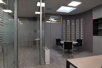 COMPONIBILITA’: I componenti della parete divisoria sono i profili di alluminio per quanto riguarda la struttura portante, per i tamponamenti ciechi è utilizzato un pannello truciolare di spessore 14 mm con un rivestimento melaminico anti-muffa ed anti-graffio su ambo i lati, per i tamponamenti trasparenti è utilizzata una lastra di vetro float, spesore 5 mm su ambo i lati, salvo richieste particolari.